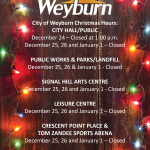 Released December 19, 2019 WEYBURN – City of Weyburn Locations will be closed or have reduced hours beginning the week of Monday, December 23, in observance of Christmas and New […]