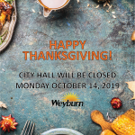 Released October 11, 2019 WEYBURN – The following City of Weyburn locations will be closed Monday, October 14th for Thanksgiving: •City Hall •Public Works Building •Signal Hill Arts Centre •Crescent […]